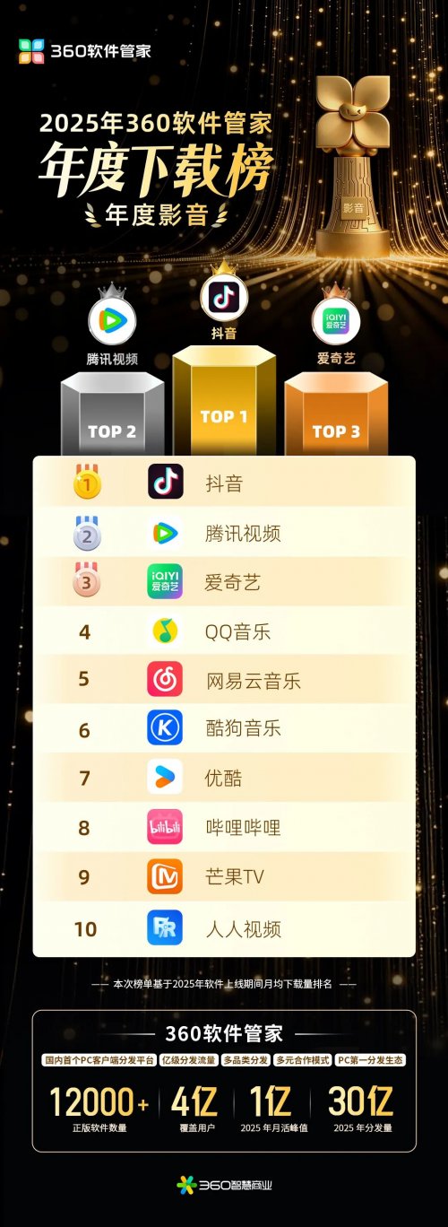“年度影音榜”里,抖音、腾讯视频、爱奇艺等凭借丰富的内容生态与个性化播放等优质体验,成为用户首选影音平台。