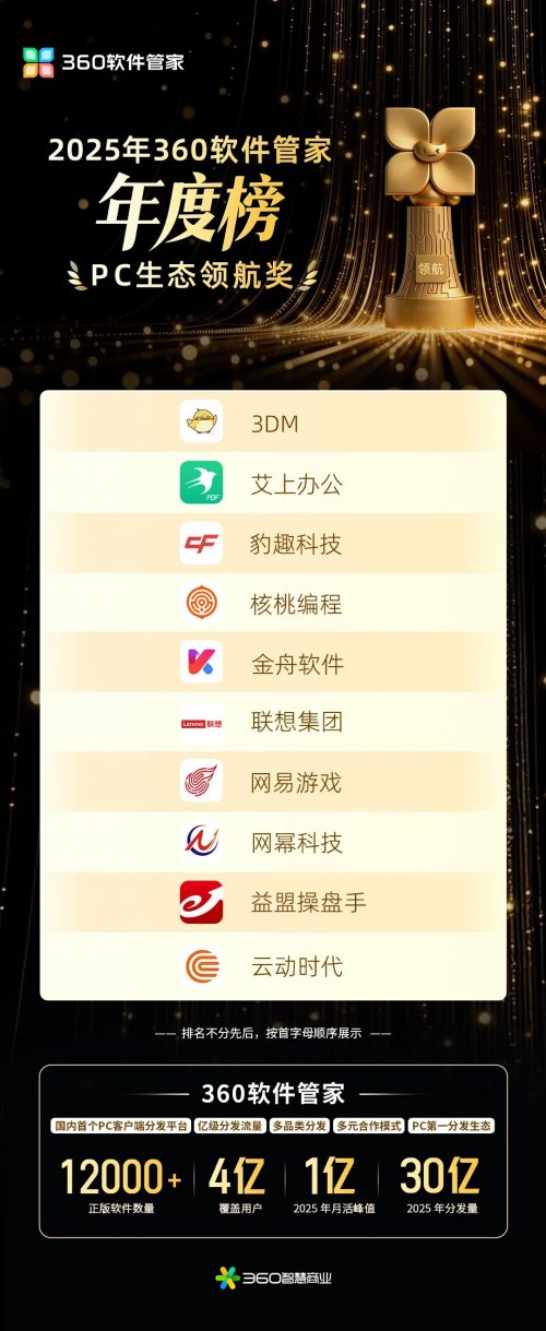 随着PC生态的持续完善,PC 端价值也将逐渐回归,360软件管家将继续深化榜单体系建设,拓展更多细分场景维度,释放平台数据价值,助力PC生态实现更高质量发展。