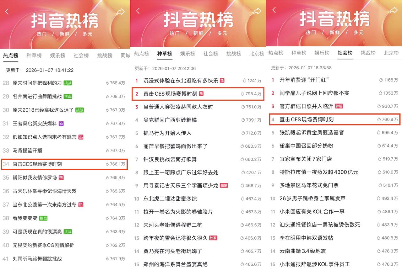 当下,有大量用户在抖音主动关注科技新品,渴望用更智能、更高效的产品提升生活体验,而CES恰是全年科技趋势的集中释放源头,在这里亮相的科技新品,常常能为日常生活带来切实升级。正因如此,许多科技爱好者早早盯紧CES动态,只为第一时间把心仪的科技好物带回家。