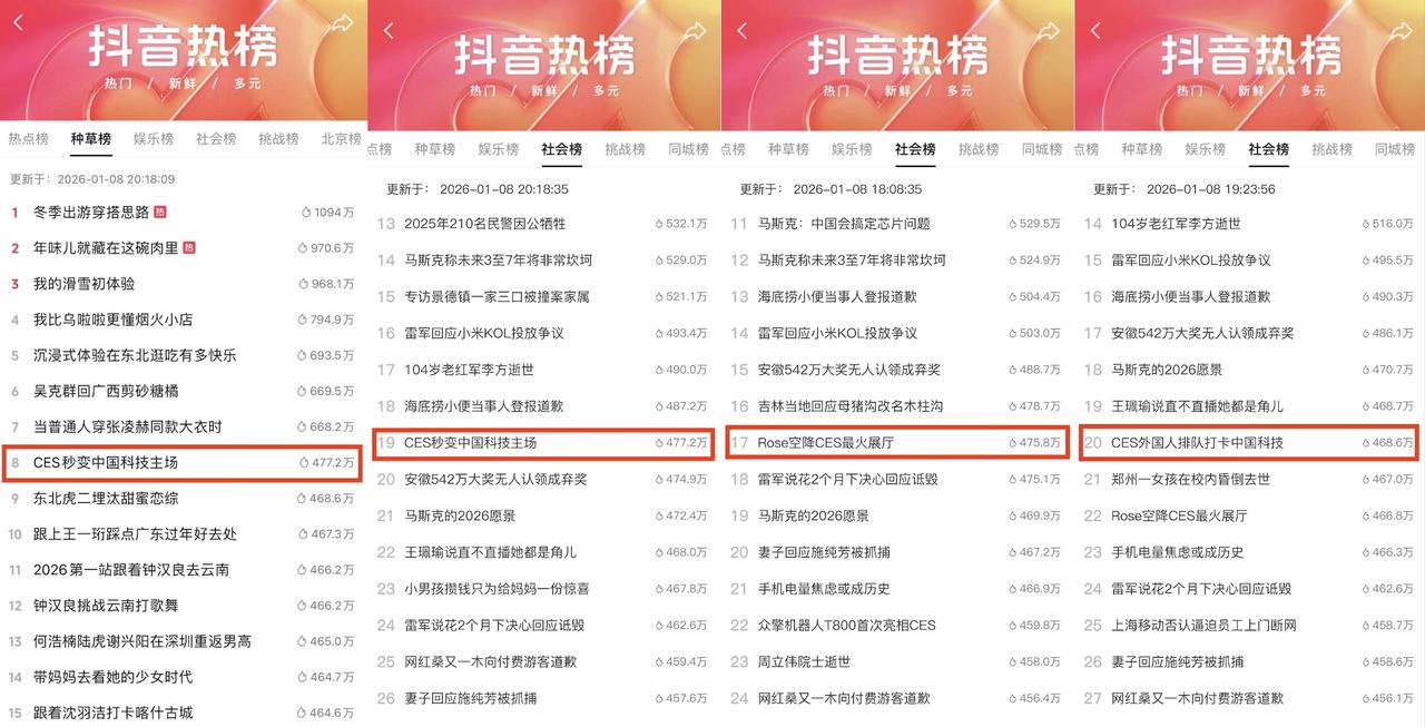 热点话题进一步放大了这种破圈效应,#直击CES现场赛博时刻 聚焦展会上视觉冲击力强的未来感瞬间,最高位登上抖音热点总榜TOP34,种草榜TOP2,社会榜TOP4;#CES秒变中国科技主场 则让大众看到中国科技创新力量在世界舞台上的集中亮相,将全球科技趋势与本土创新自信相连接,最高位登上种草榜TOP8,社会榜TOP20。通过「上新了!在抖音」的同步上新能力,用户可以即刻拥有感兴趣的科技新品,让每一次消费都承载深厚的情感价值。